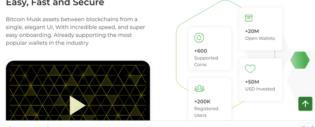 Bitcoin Musk is a very fast, easy and secure ecosystem , the platform musk assets between various blockchains from a single well designed UI , high speed and easy onboarding . The platform has been supportive to varieties of wallets in the industry . Currently Bitcoin Musk covers and supported 600+ cryptocurrencies. It is an ecosystem that has achieved over 200,000 Users worldwide and support open wallets. Currently, over $50 million USD has been invested in the platform .